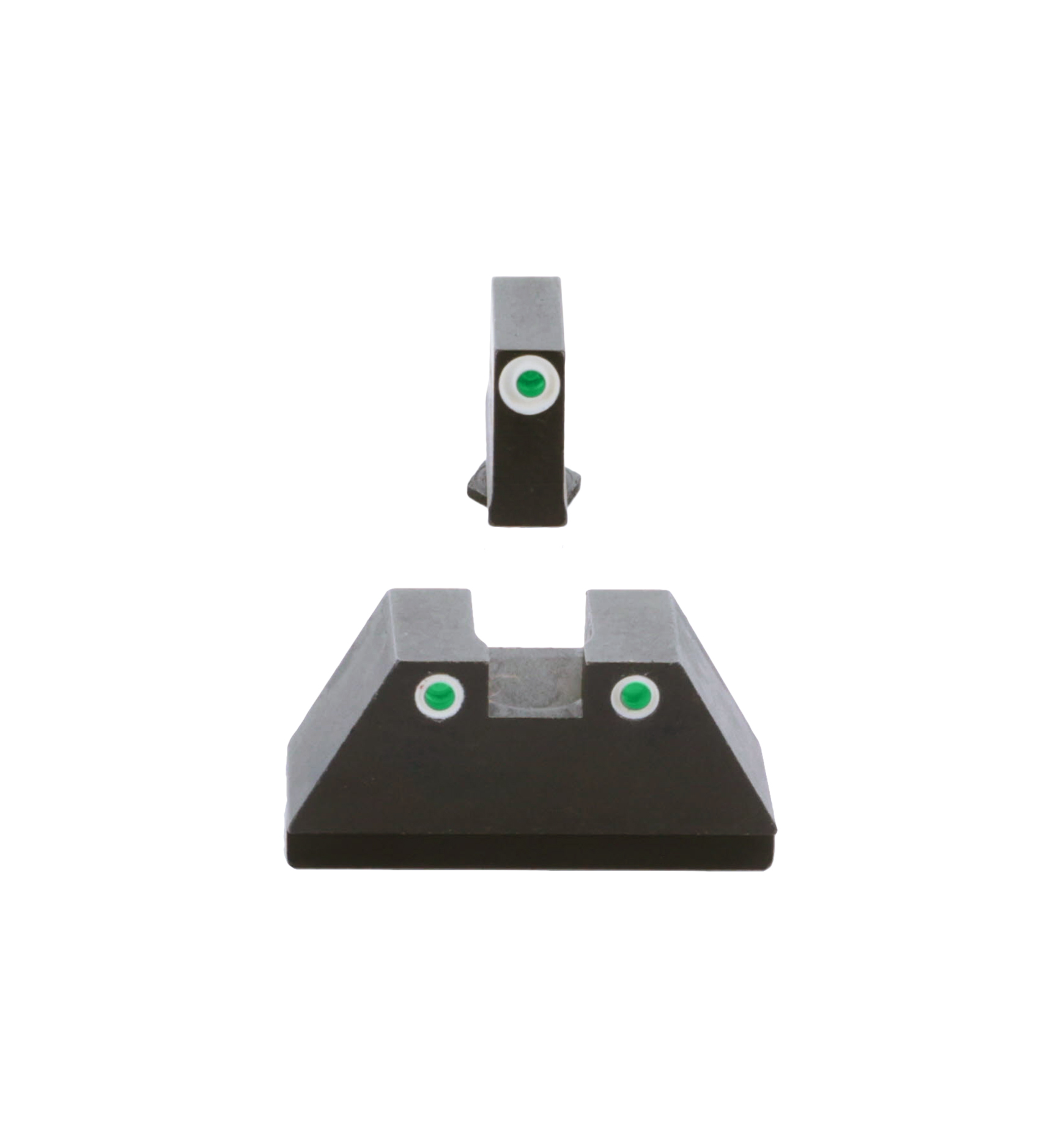 High-visibility front and rear sights with bright paint or optional tritium inserts